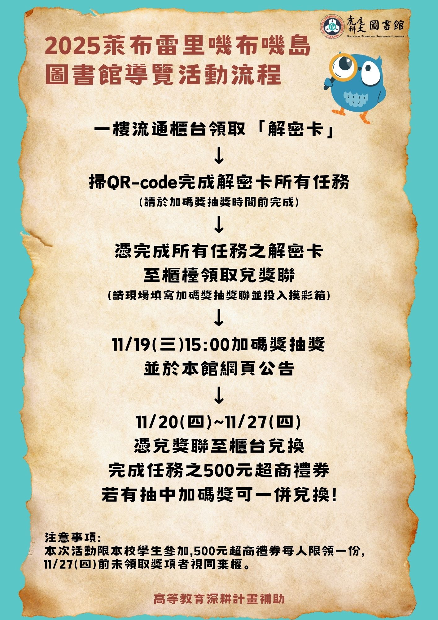本學期圖書館推出全新主題「萊布雷里嘰布嘰島」導覽暨借閱推廣活動,於一樓大廳展出導覽影片及書展,即日起開放至一樓流通櫃台領取解密卡,解開任務同時了解本館的各項資源及空間配置,完成所有任務即可兌換限量100份的500元超商禮券並獲得「加碼獎」抽獎資格,先換先贏!!